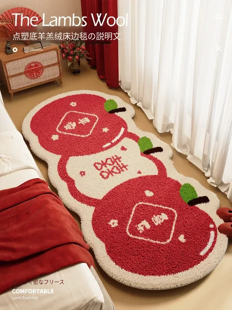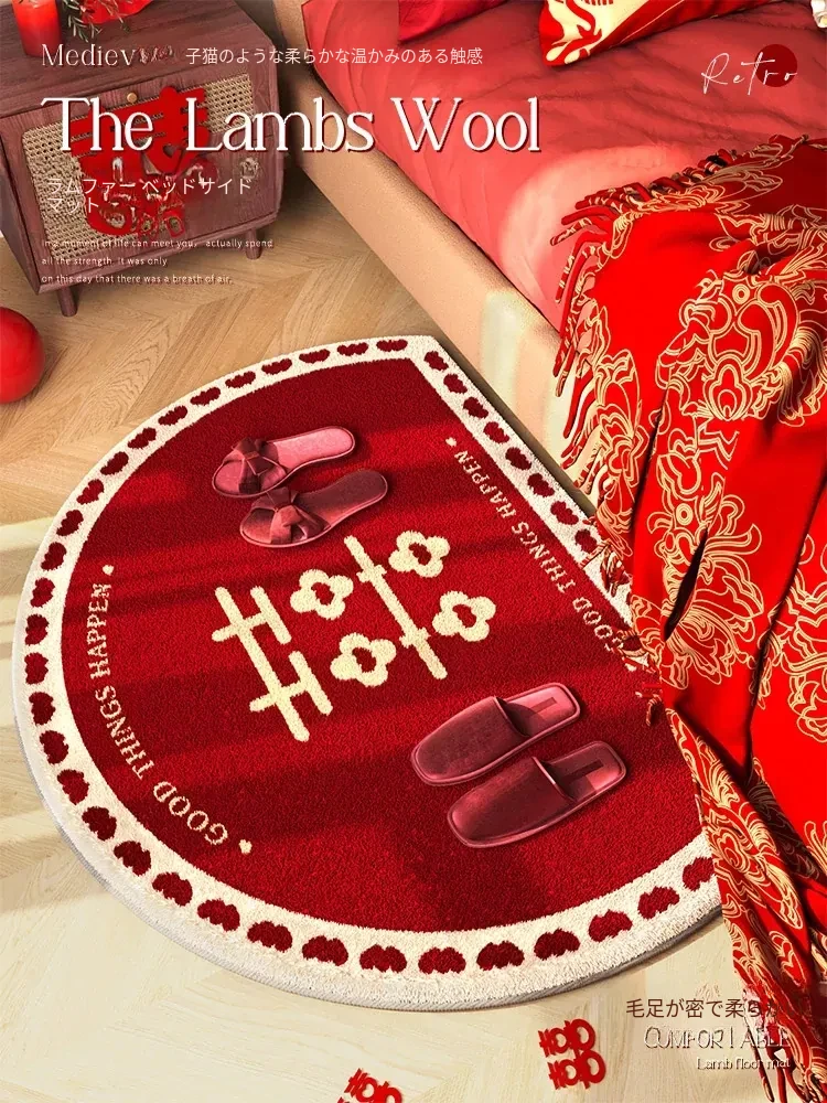 新中式デザインの赤いベッドサイドマット、年末年始の祝いにぴったり!ユニークな形状のベッド下装飾マット、冬に最適なふわふわなラグで快適な寝室を演出します。
