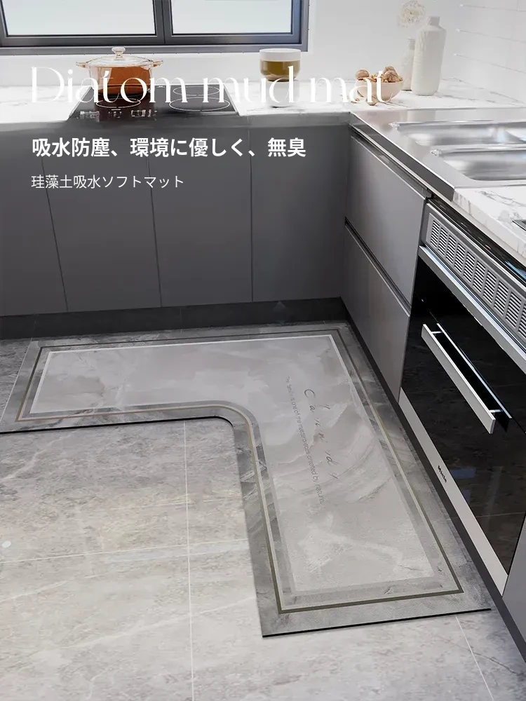 2025年新款キッチン専用マット!油汚れをシャットアウト、拭くだけで簡単お手入れ。吸水性抜群のシリカゲル素材で滑り止め効果もあり、厚みのある快適なデザインで、料理も楽しくなる!