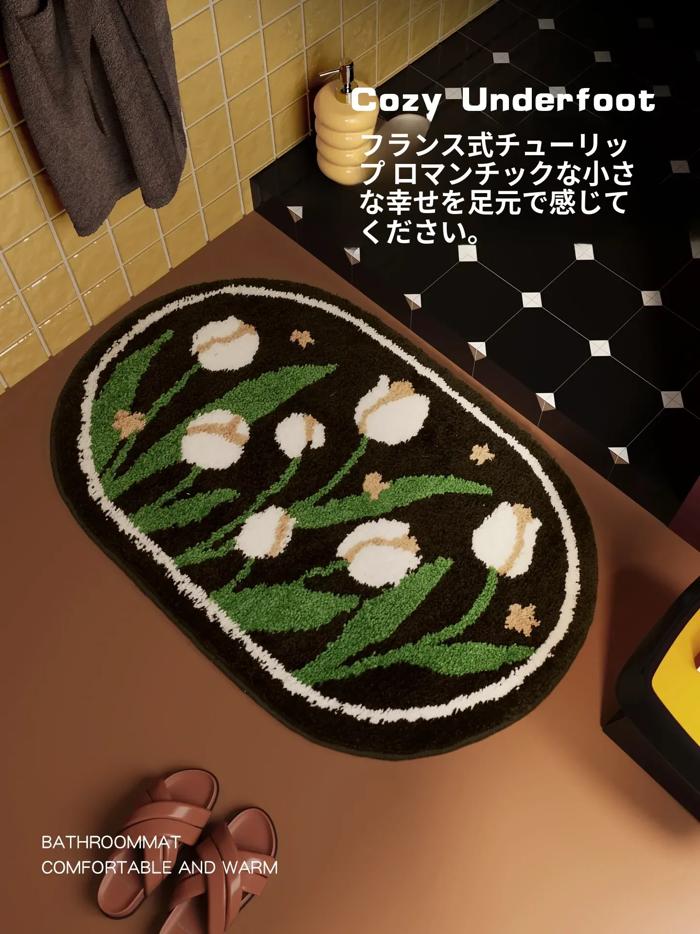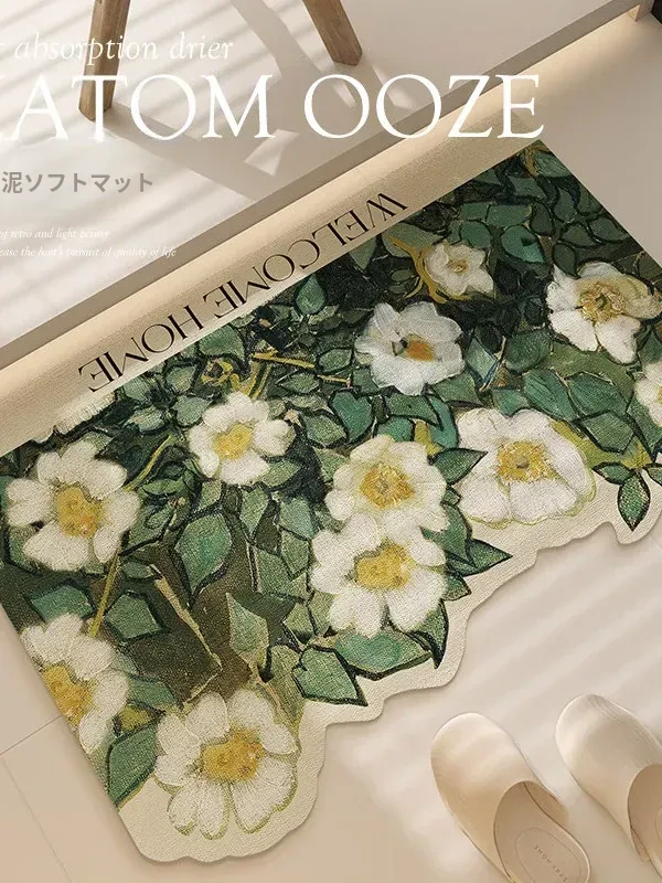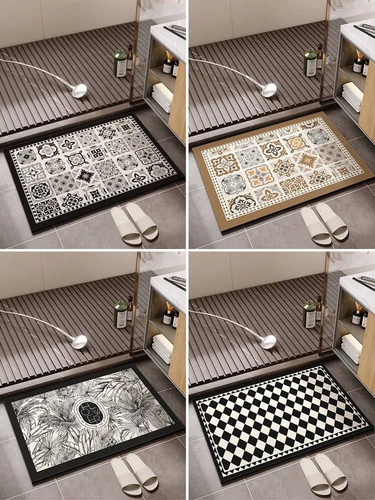 レトロ風バスルームマット - 吸水性抜群のシリカゲル素材使用!滑り止め&速乾性で安全安心。高級感溢れるデザインで、トイレの入り口をおしゃれに演出します。あなたのバスルームを格上げする一品!