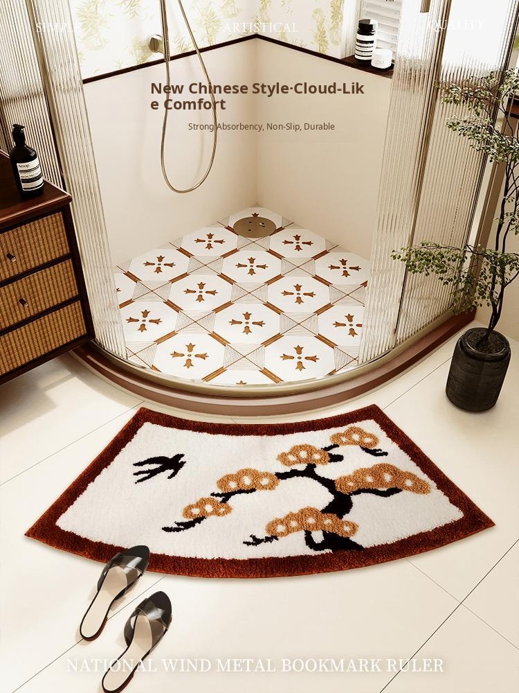 Elegant New Chinese Style Bathroom Mat - Soft Arc-Shaped Water-Absorbent Carpet for Bathtub Side, Plush Velvet Feel, Perfect for a Luxurious Touch in Your Restroom