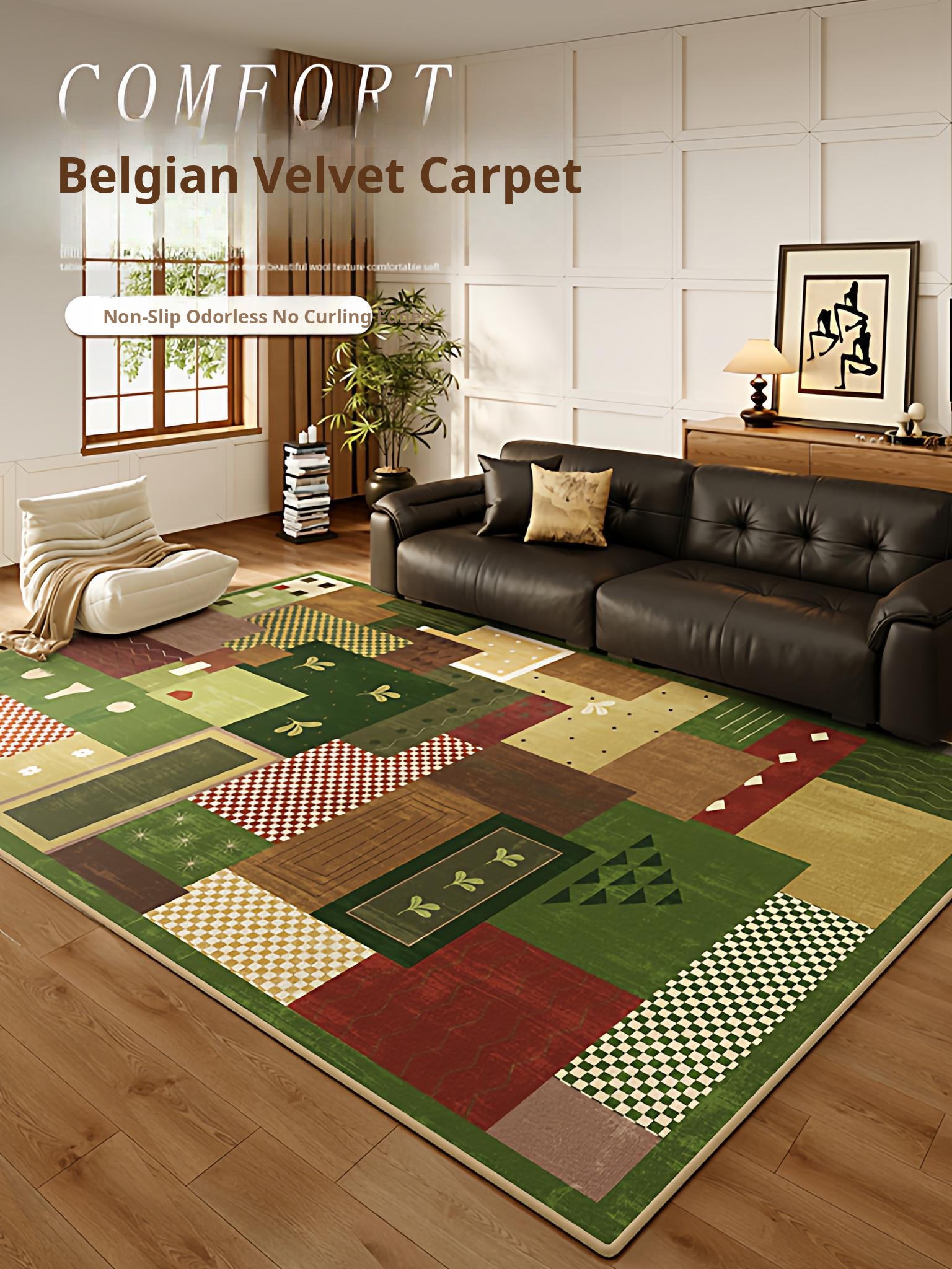 Vintage-Inspired Green Luxury Area Rug - High-End Soft Carpet for Living Room & Bedroom, Washable Sofa Mat, New Collection 2026