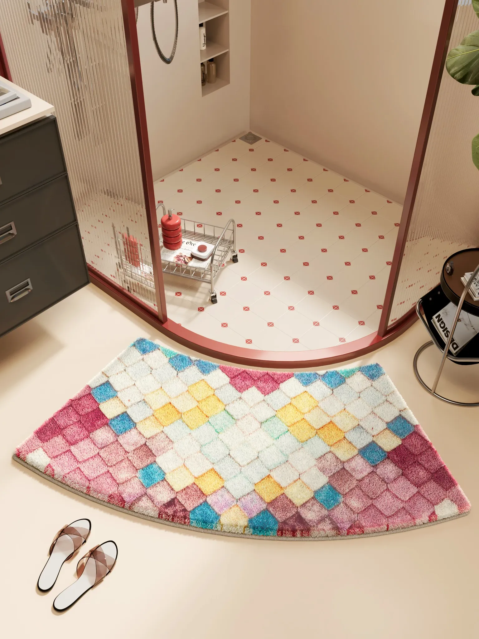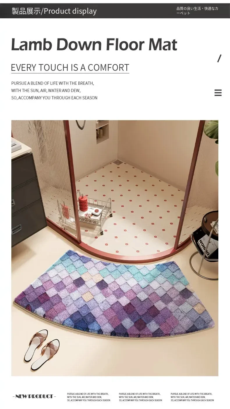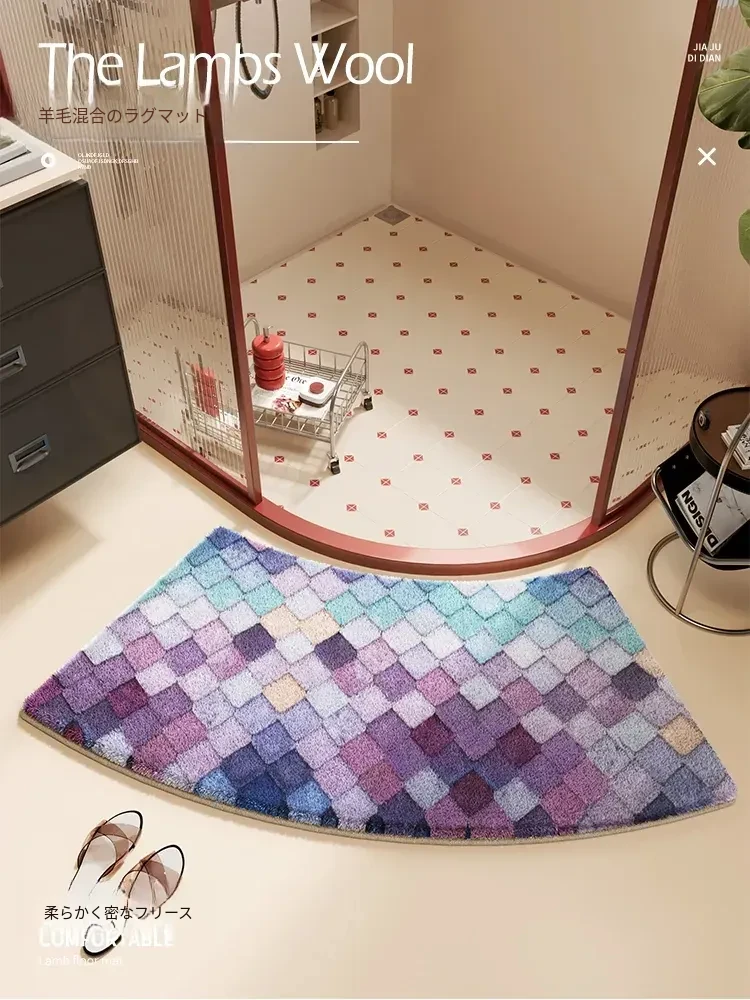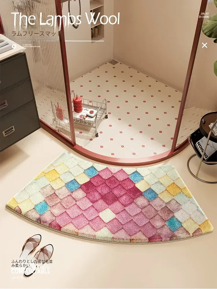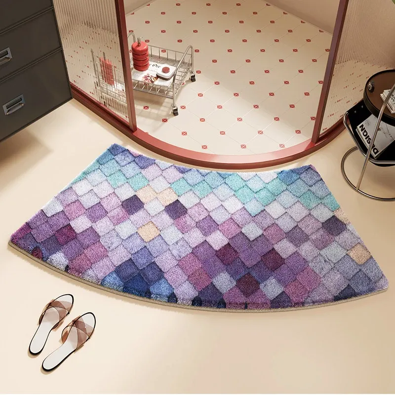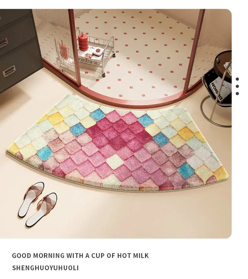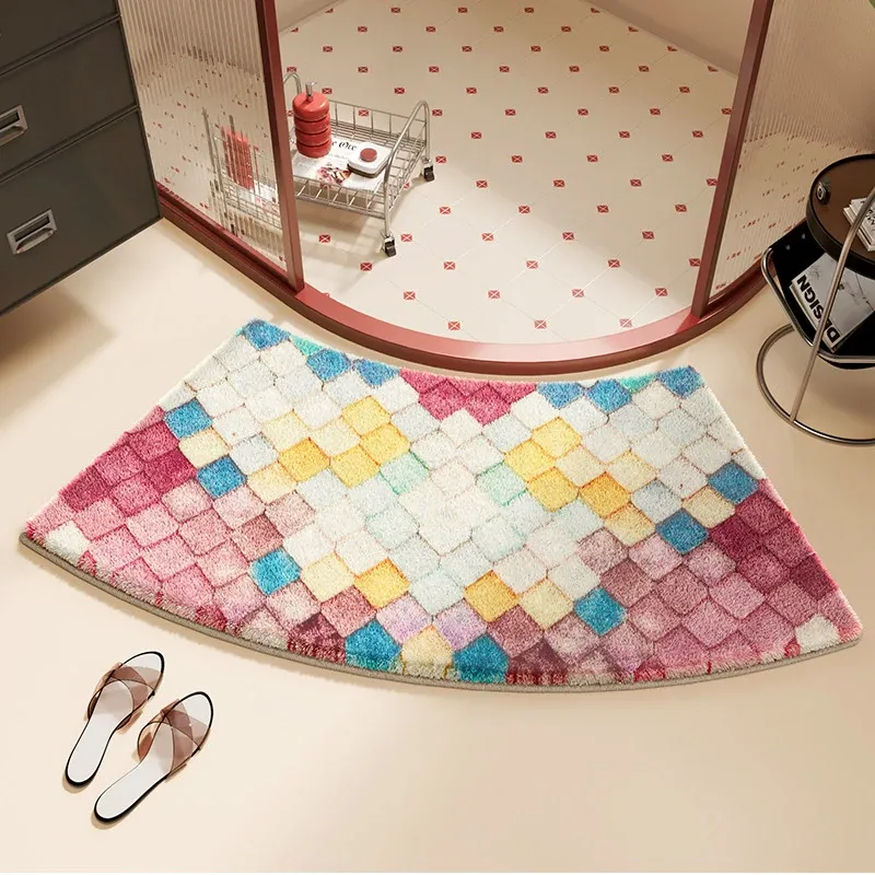 カラフルダイヤモンドパターンの底付きラビットファー風バスルームマット - アーチ型