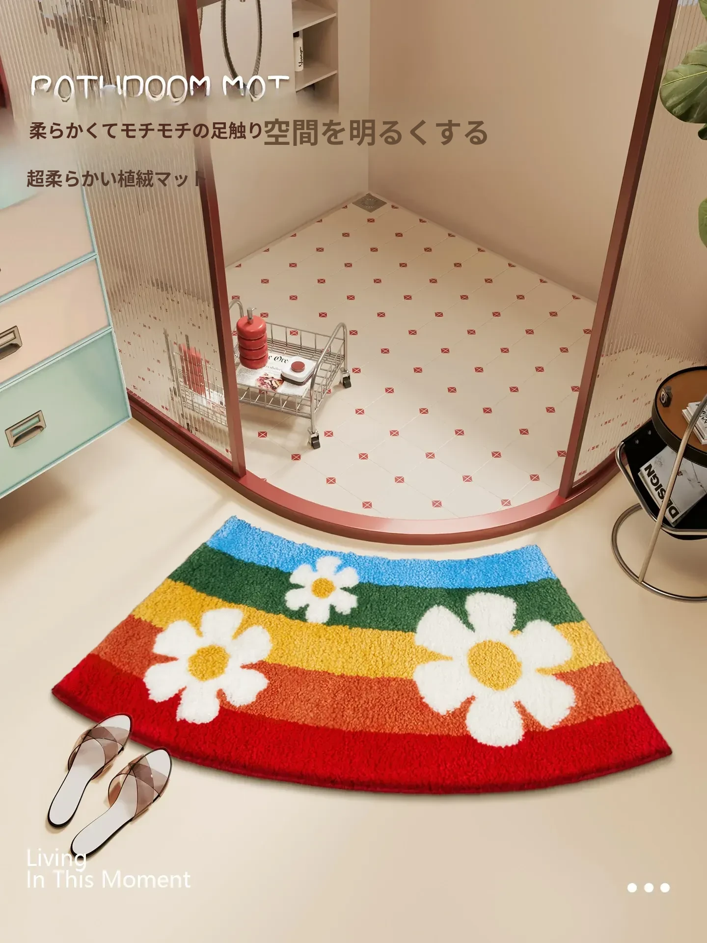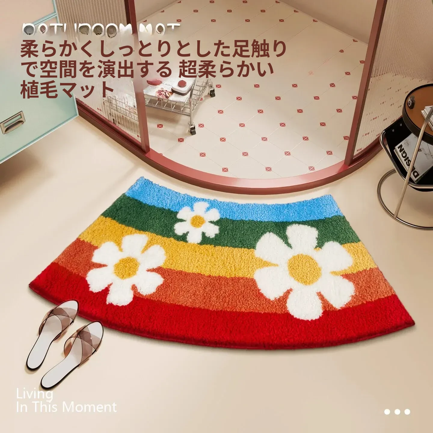 虹のアーチ型バスルームマット - 吸水性抜群の扇形フロッキングデザイン!シャワールームに最適なふわふわ防滑フットマットで、快適なバスタイムを演出します。あなたのトイレを彩るアイテム!