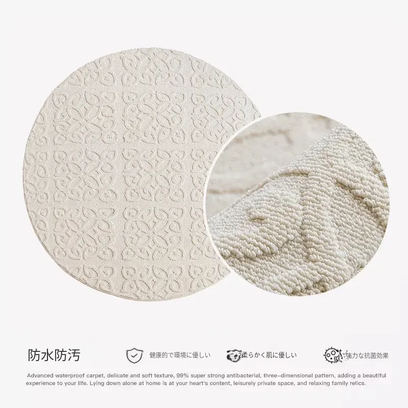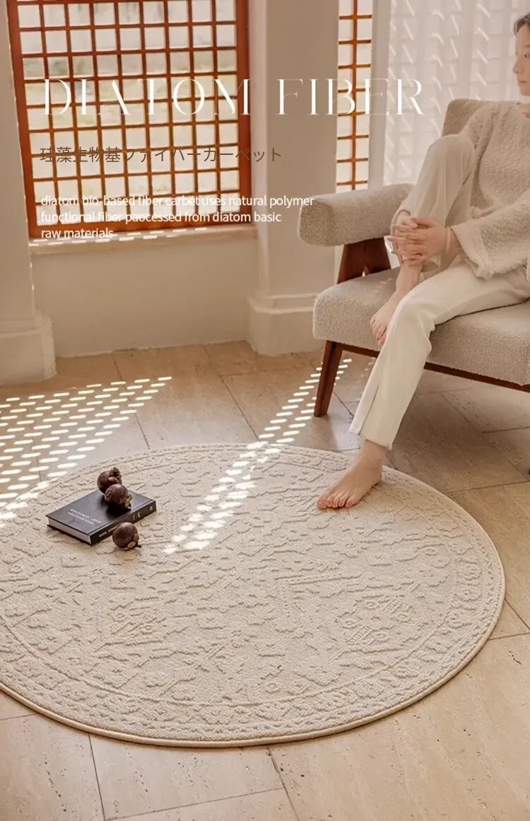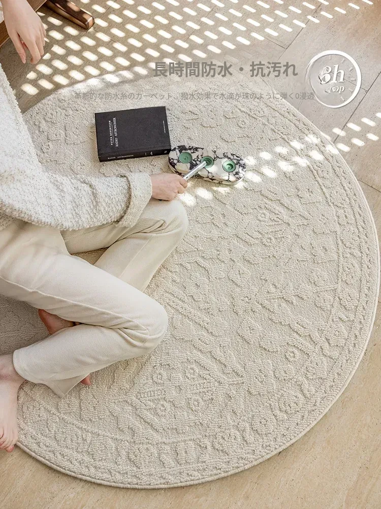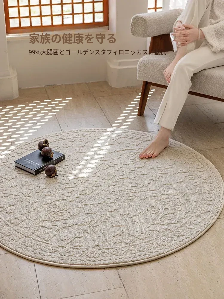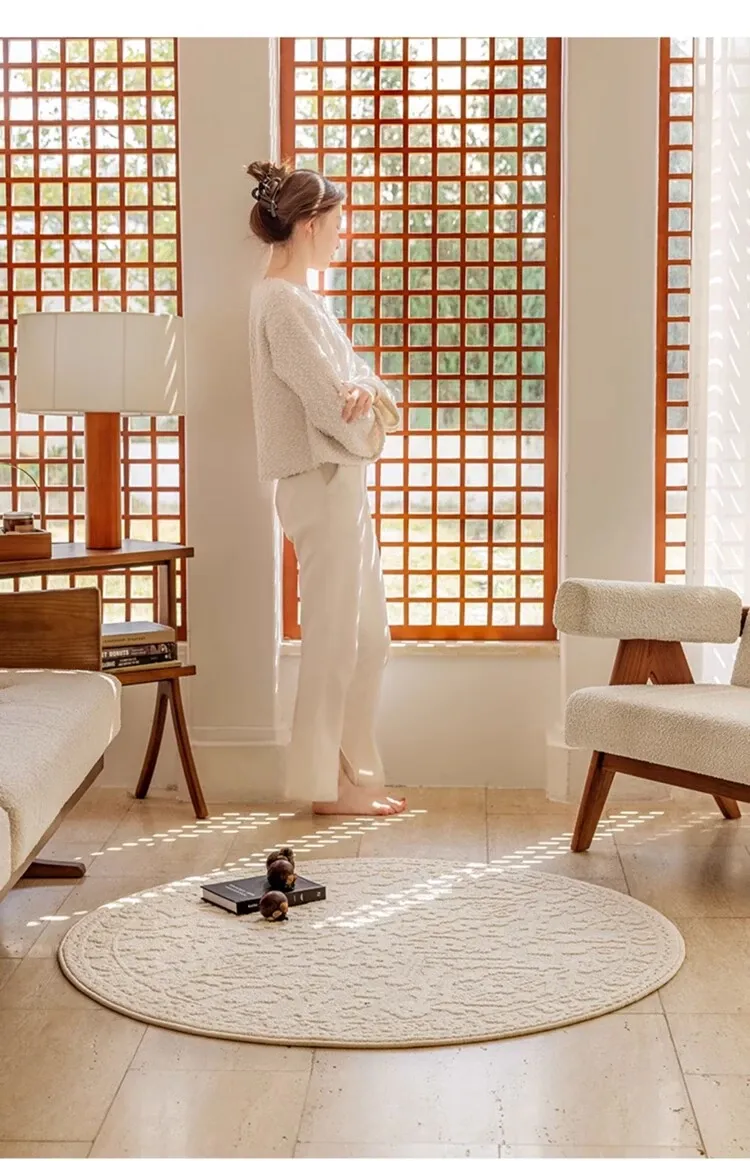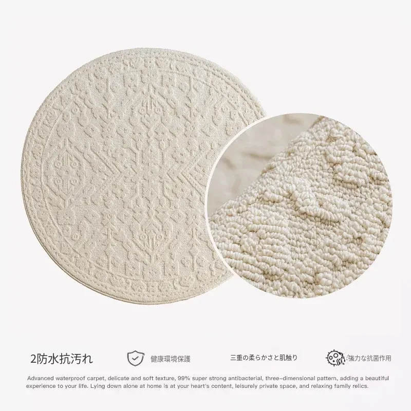 和の美を感じる侘寂スタイルの円形ラグ - インテリアにぴったり!防水・防汚機能付きで、リビング、書斎、寝室、クローゼットに最適。おしゃれなティーテーブルやソファのアクセントにもなる一品です。